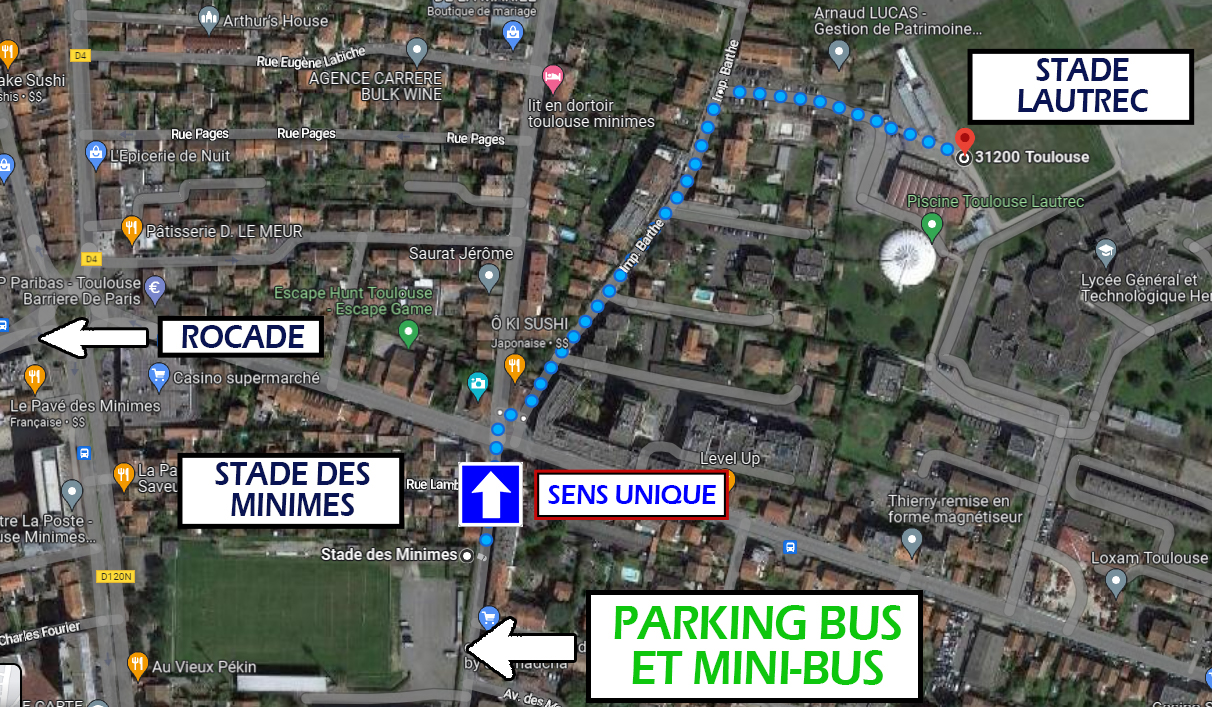 Cependant, TOUS LES BUS ET MINI-BUS DEVRONT STATIONNER SUR LE PARVIS DU STADE ARNAUNE (107 Avenue Frédéric Estèbe 31200 Toulouse) à 500m à pied du complexe sportif Toulouse Lautrec. La circulation le long de l’Impasse Barthe sera perturbé, nous demandons donc à tous les participants de privilégier le parking du stade Arnauné. Le plan d’accès est disponible ici.